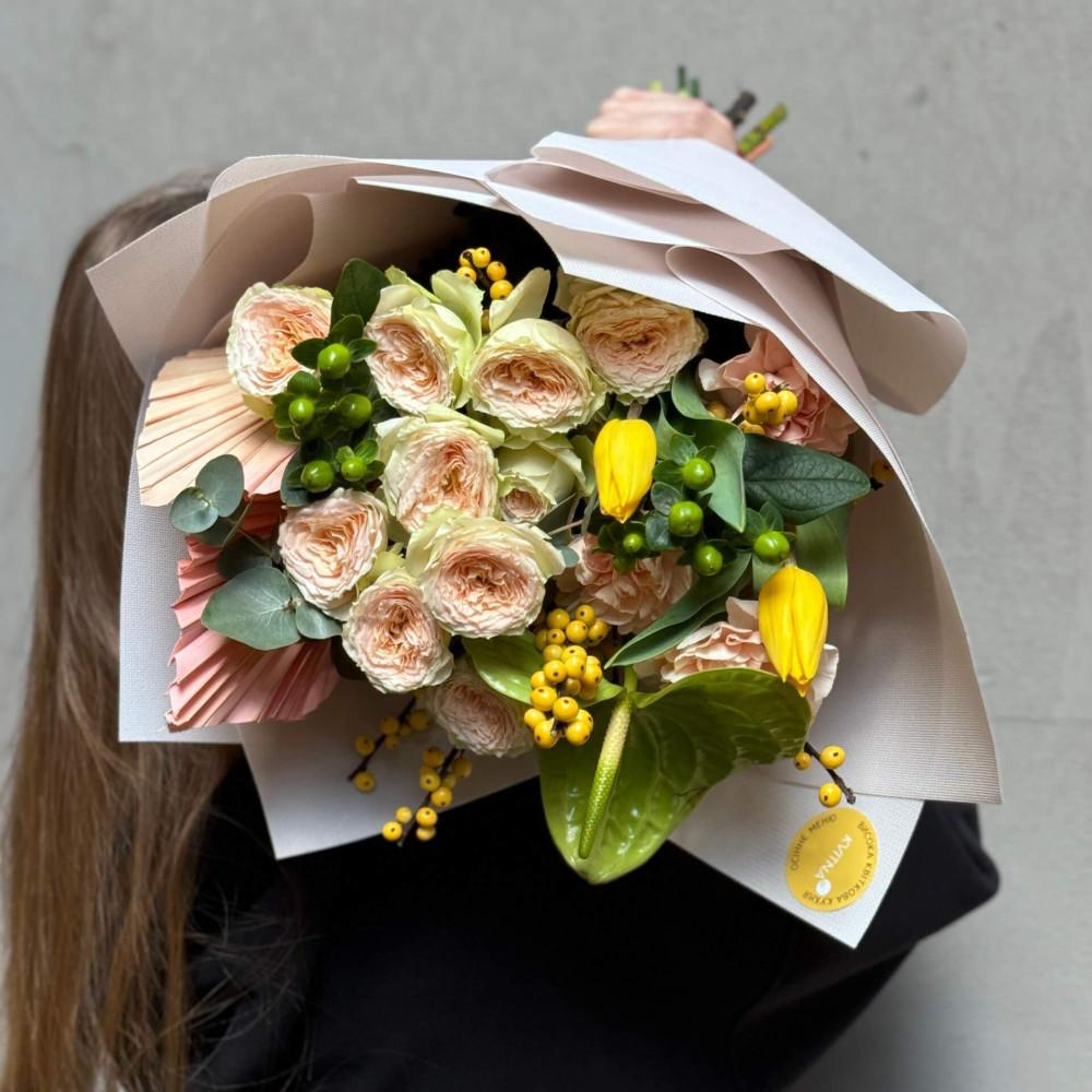 Цветы: Антуриум, Илекс, Хиперикум, Тюльпан, Диантус (Гвоздика), Роза пионовидная кустовая, Эвкалипт