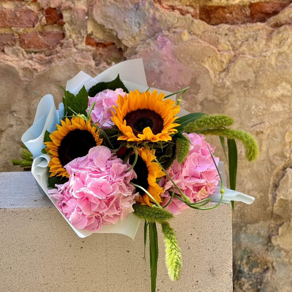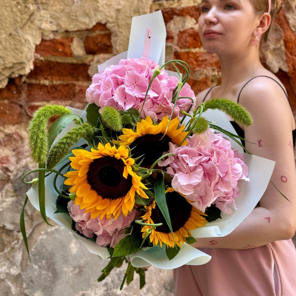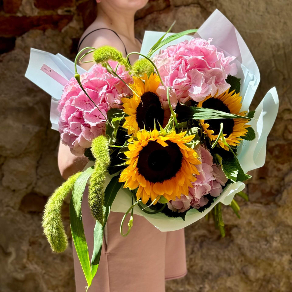 - Как заказать Летний букет из подсолнухов и гортензии в сочетании с травами «Солнечные облачка»? ❯