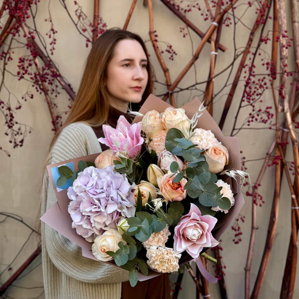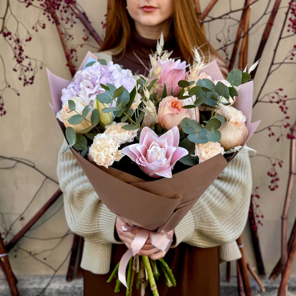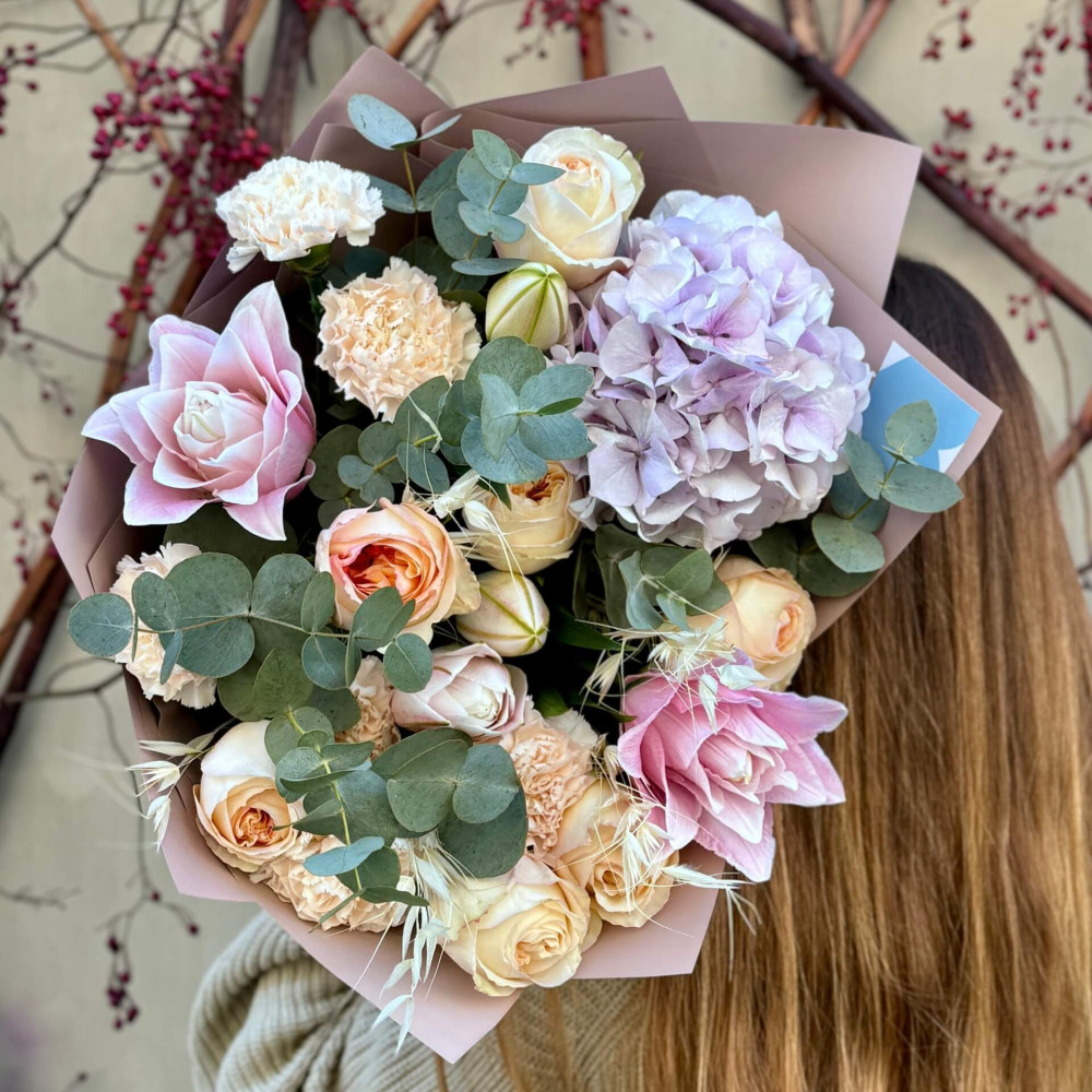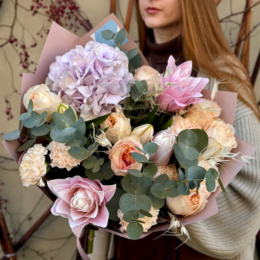 Цветы: Гортензия, Эвкалипт, Роза пионовидная, Лилия, Диантус (Гвоздика)