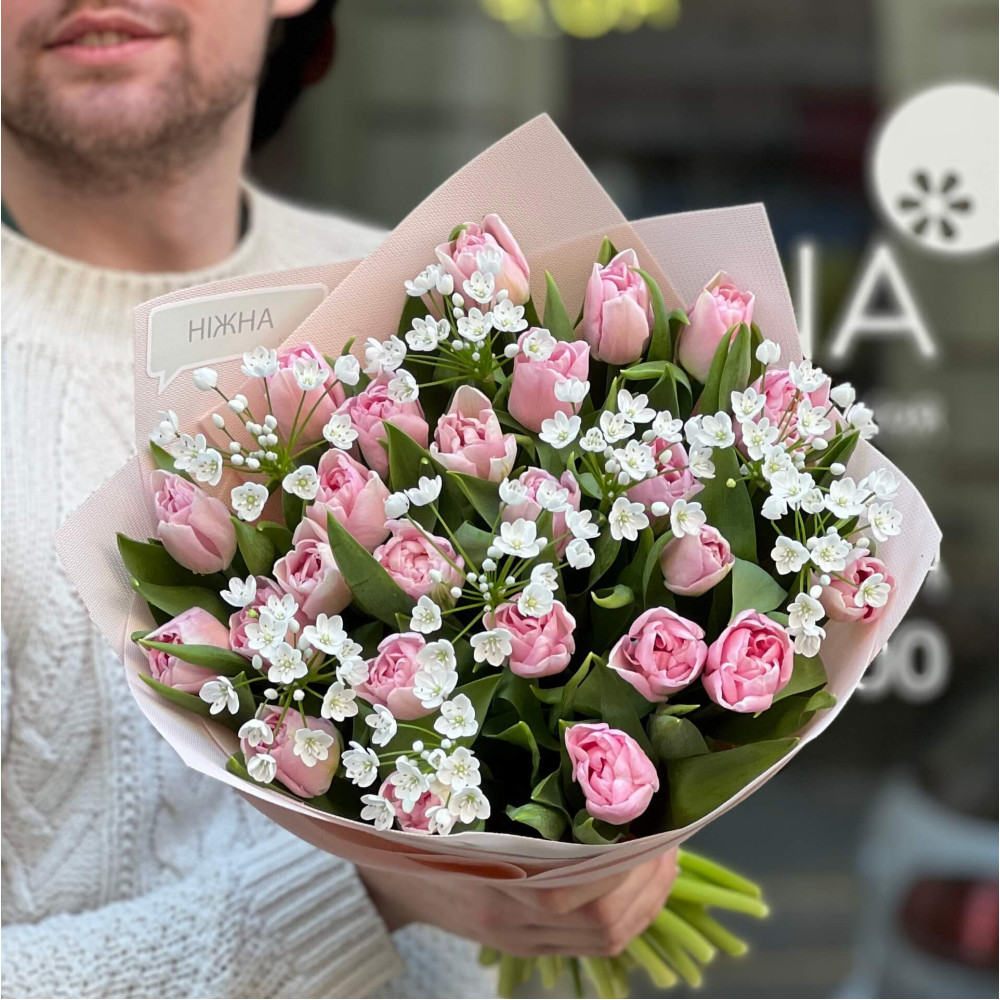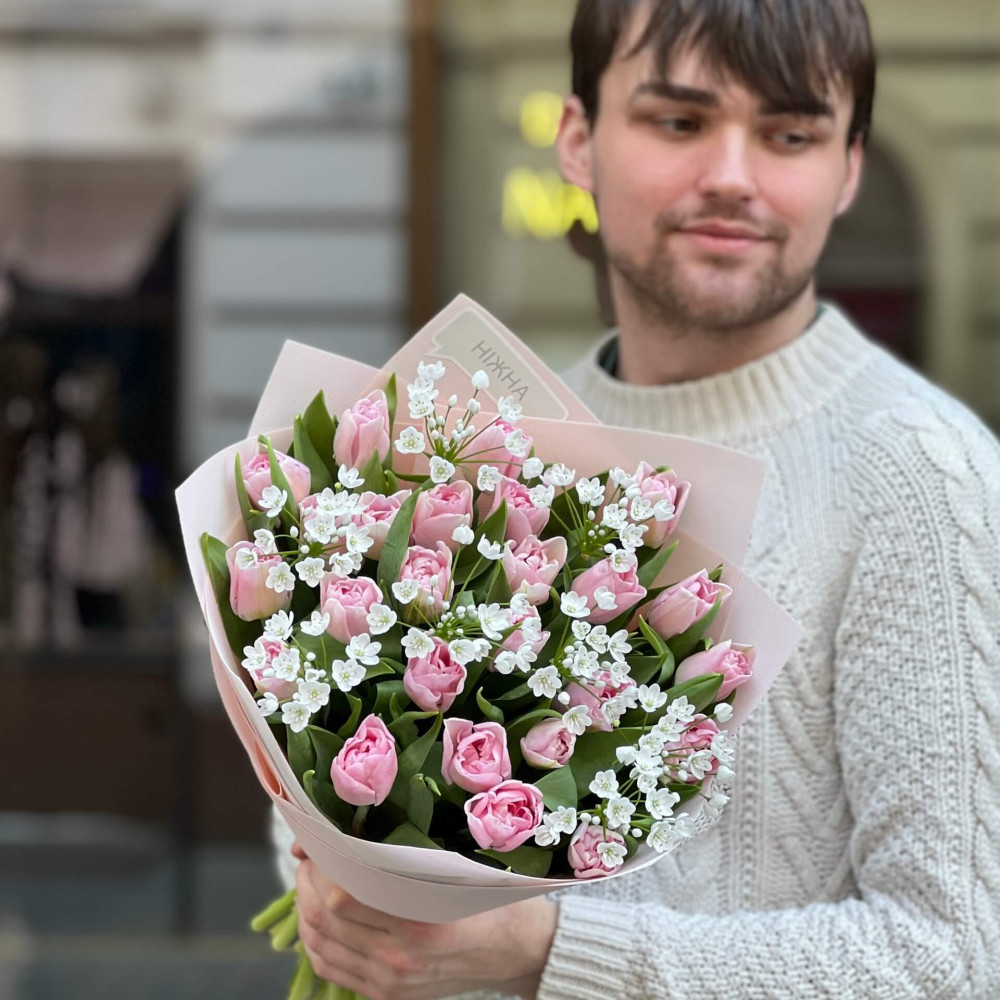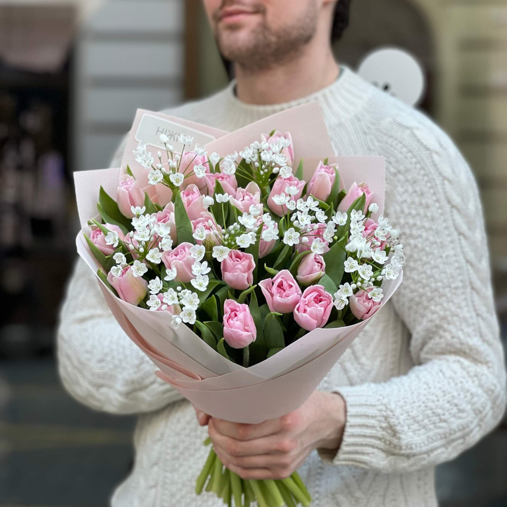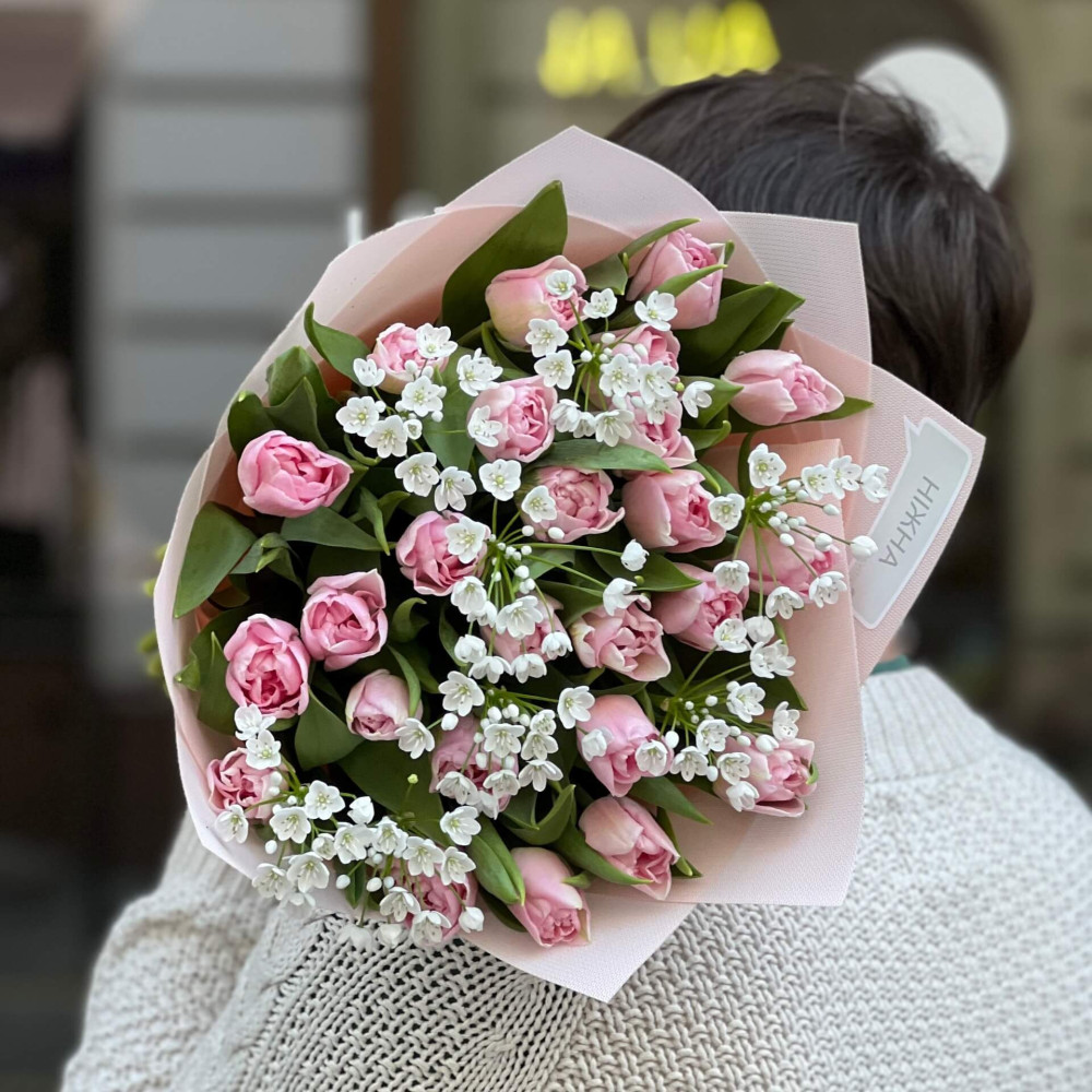 - Как заказать Нежный букет с пионовидными тюльпанами и аллиумом «Романтические первоцветы»? ❯
