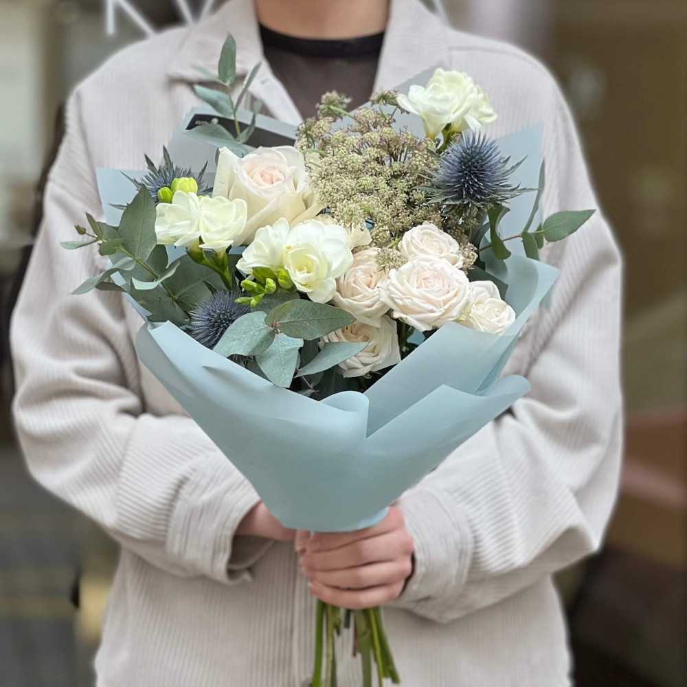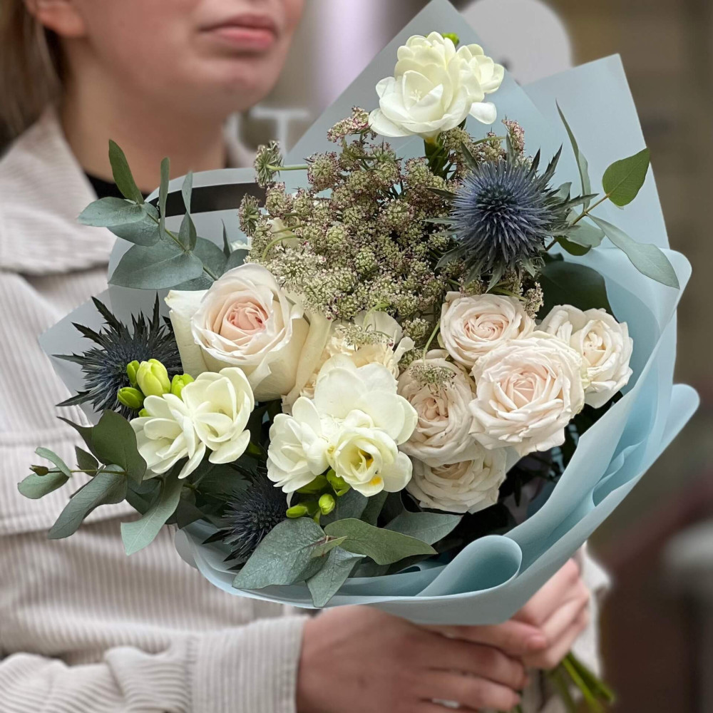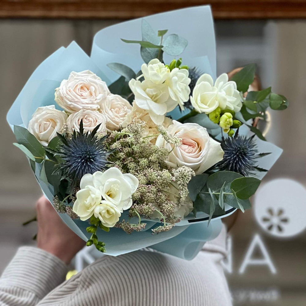 Цветы: Роза пионовидная, Даукус, Диантус (Гвоздика), Эрингиум, Эвкалипт, Роза кустовая, Фрезия