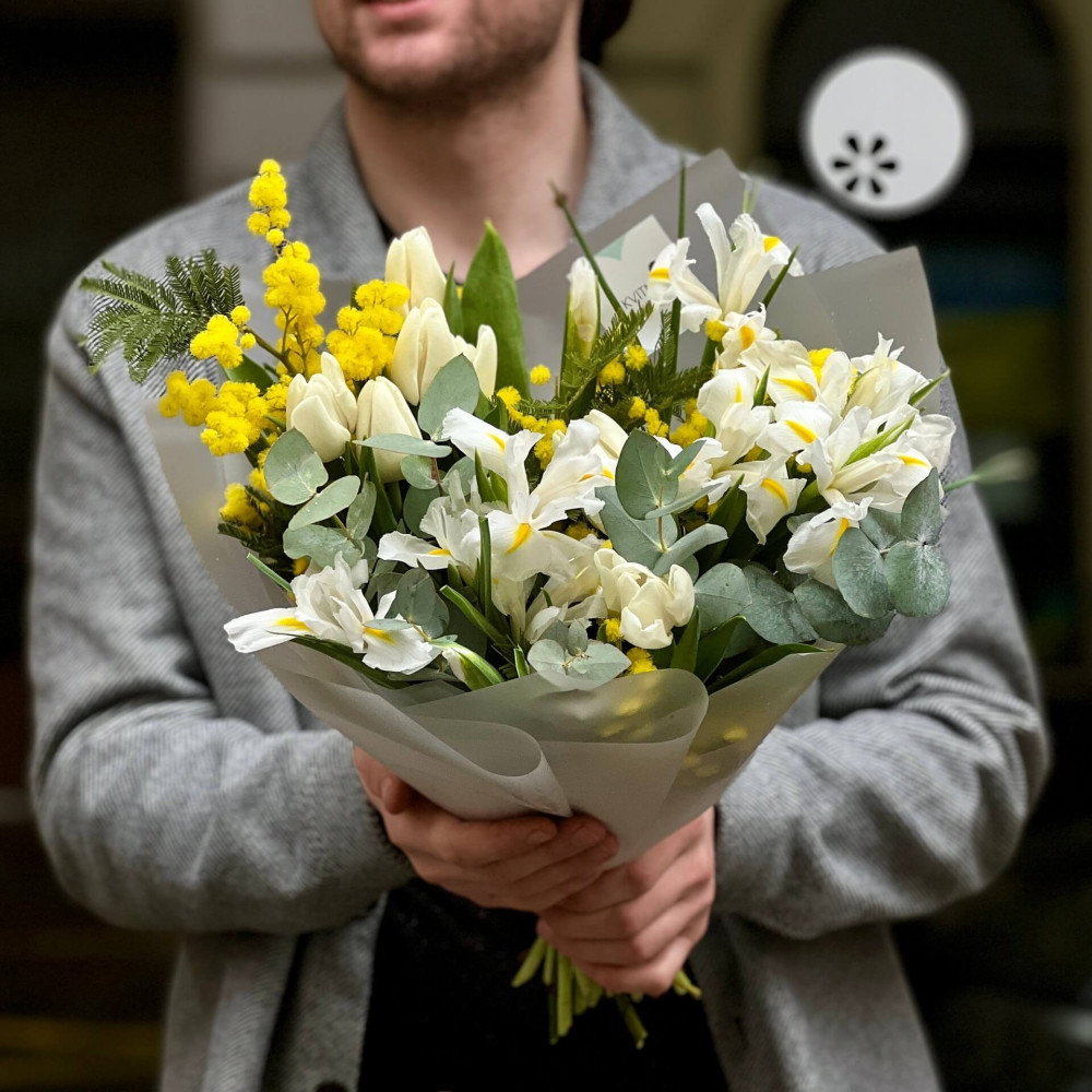 Цветы: Ирис, Тюльпан, Эвкалипт, Мимоза