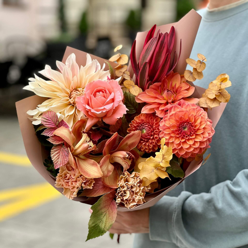 Цветы: Эвкалипт, Малина (листья), Цимбидиум, Диантус (Гвоздика), Георгина, Леукадендрон, Роза пионовидная