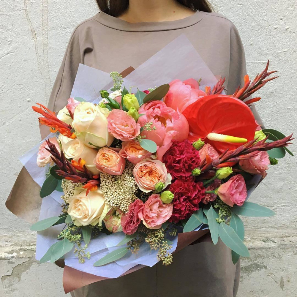 От розы айвори, через розовый диантус, коралловый пион и садовую розу, к яркому красному Антуриуму, символизирующему любовь.
