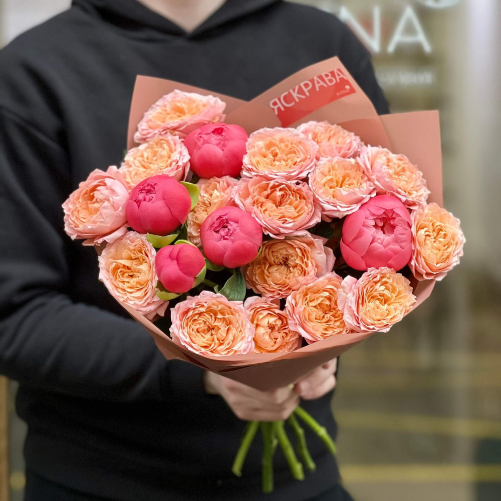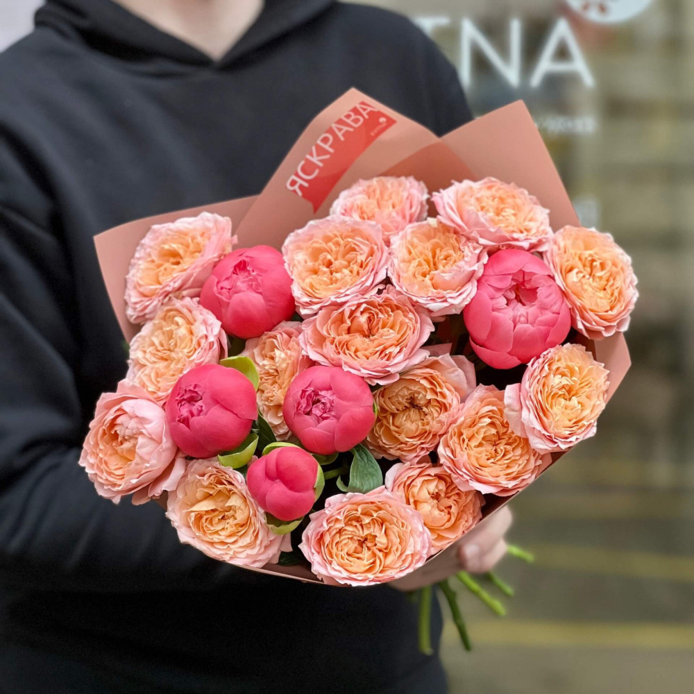 - Как заказать Персиковый букет с кустовой розой и пионами «Коралловое ожерелье»? ❯