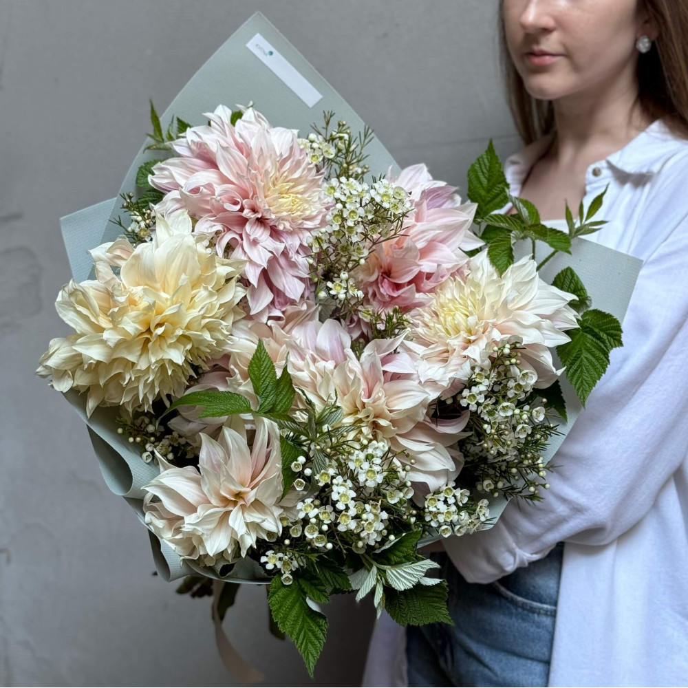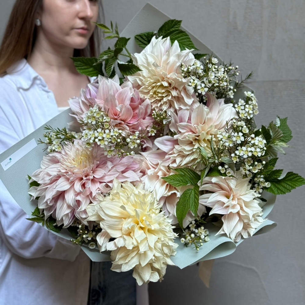 - Как заказать Пушистый букет из далий Cafe Au Lait и хамелациума «Августовское приветствие»? ❯