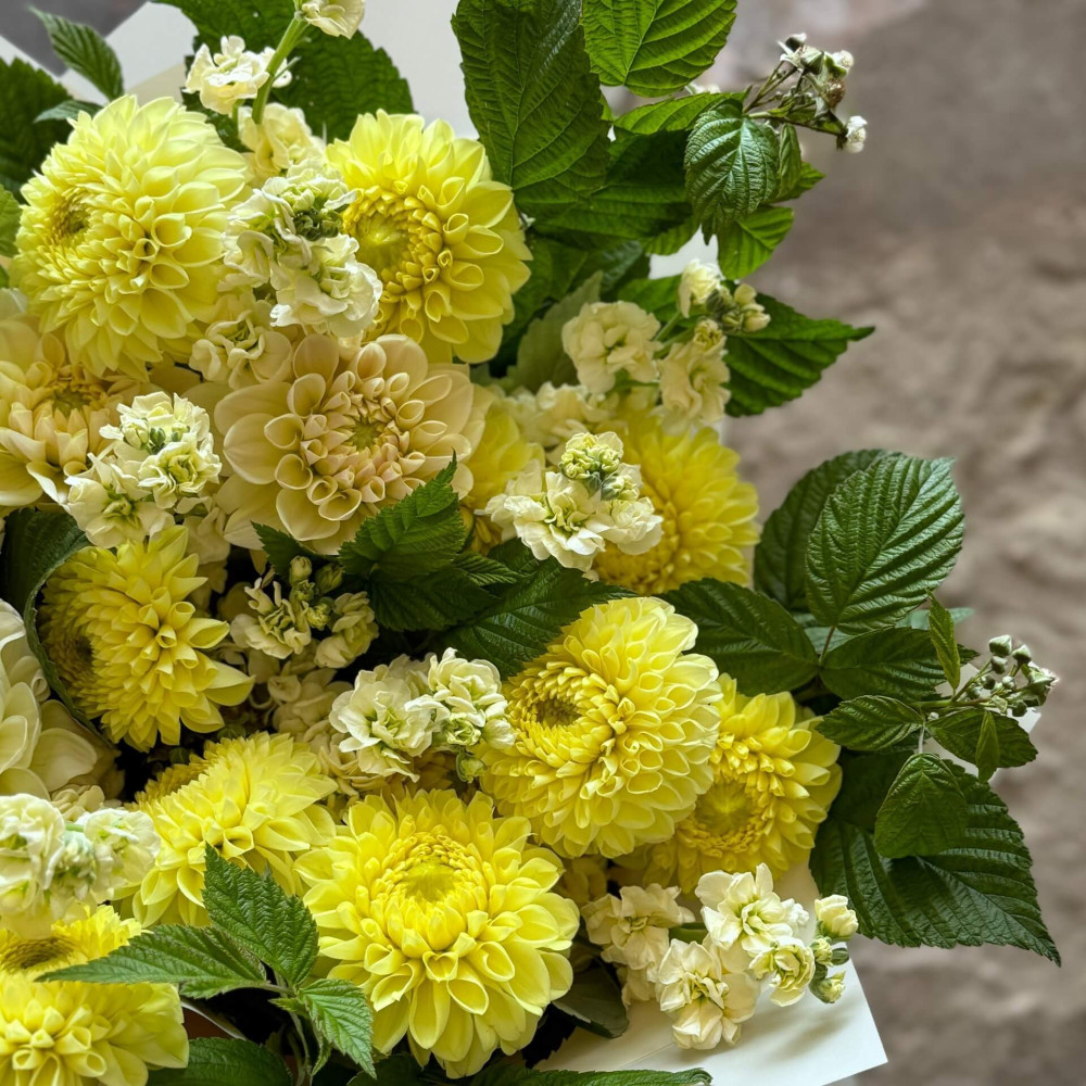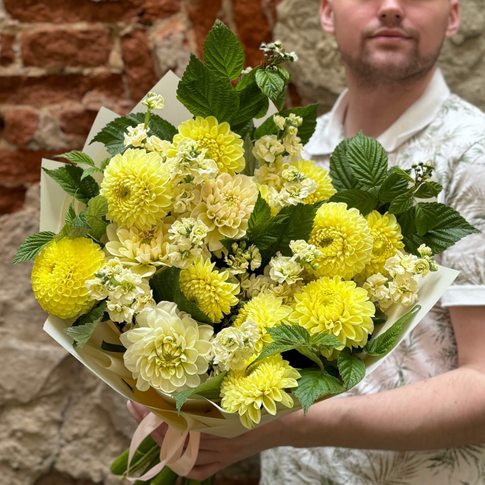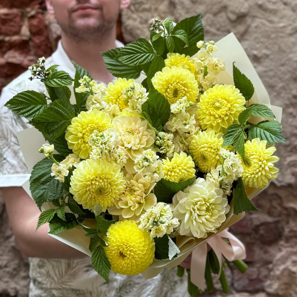 - Как заказать Радостный букет из георгин и маттиолы «Сливочное солнце»? ❯