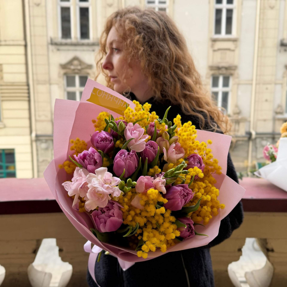 - Как заказать Радостный букет с пионовидными тюльпанами «Приветствие для милой»? ❯