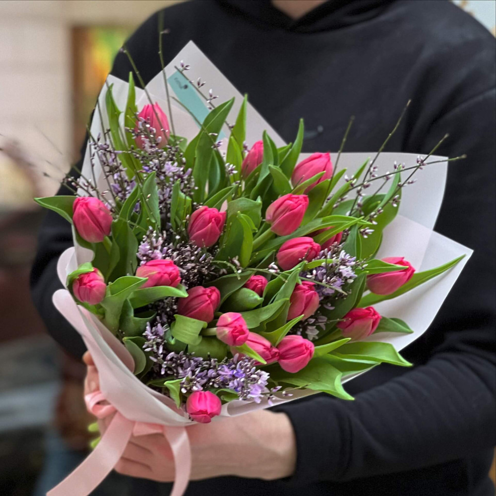 - Как заказать Розовый букет с тюльпановым хрустом «Малиновый привет»? ❯