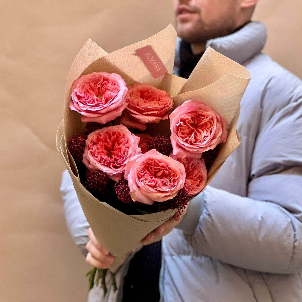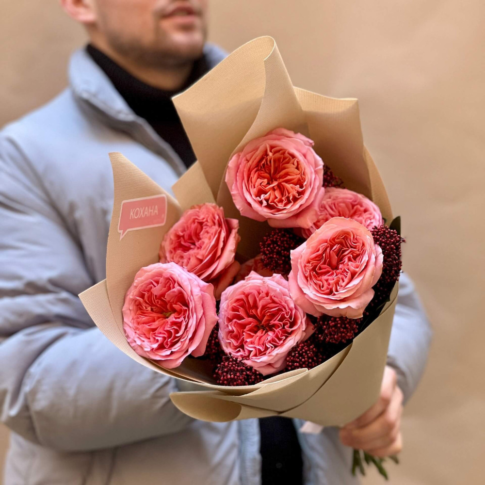 - Как заказать Розовый букет из пионовидных роз и скиммии «Романтическая встреча»? ❯