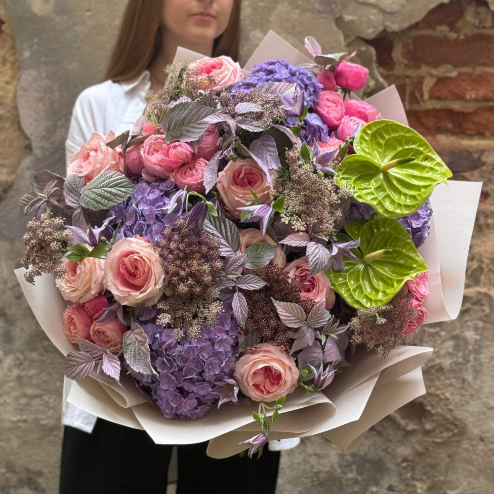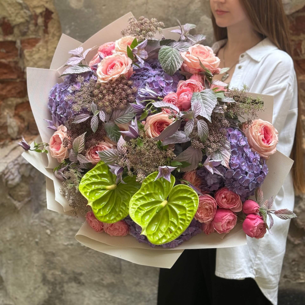 Цветы: Роза пионовидная, Клематис, Малина (листья), Роза пионовидная кустовая, Антуриум, Гортензия, Даукус