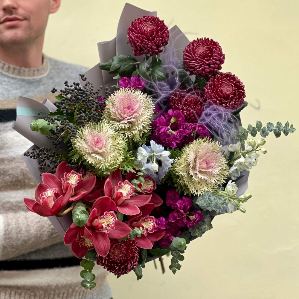 - Как заказать Роскошный букет в насыщенных цветах с цимбидиумом «Зимняя Экзотика»? ❯
