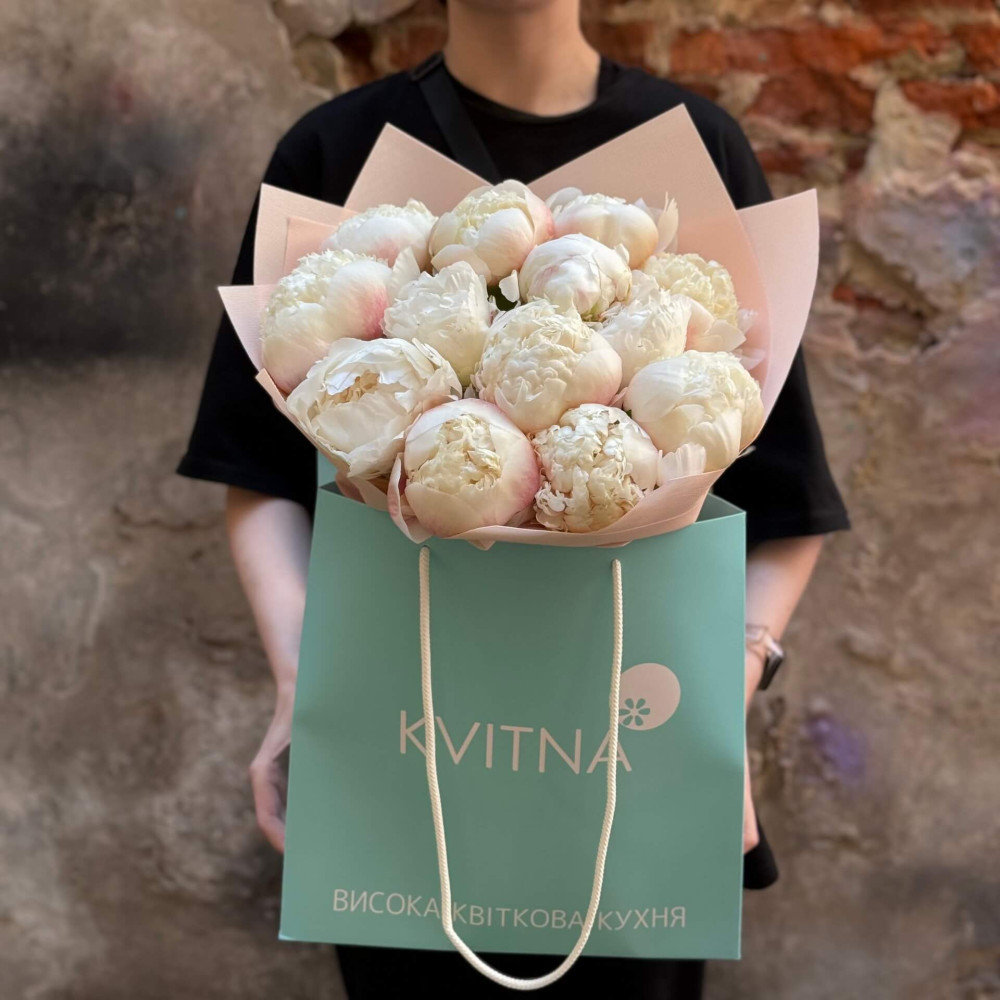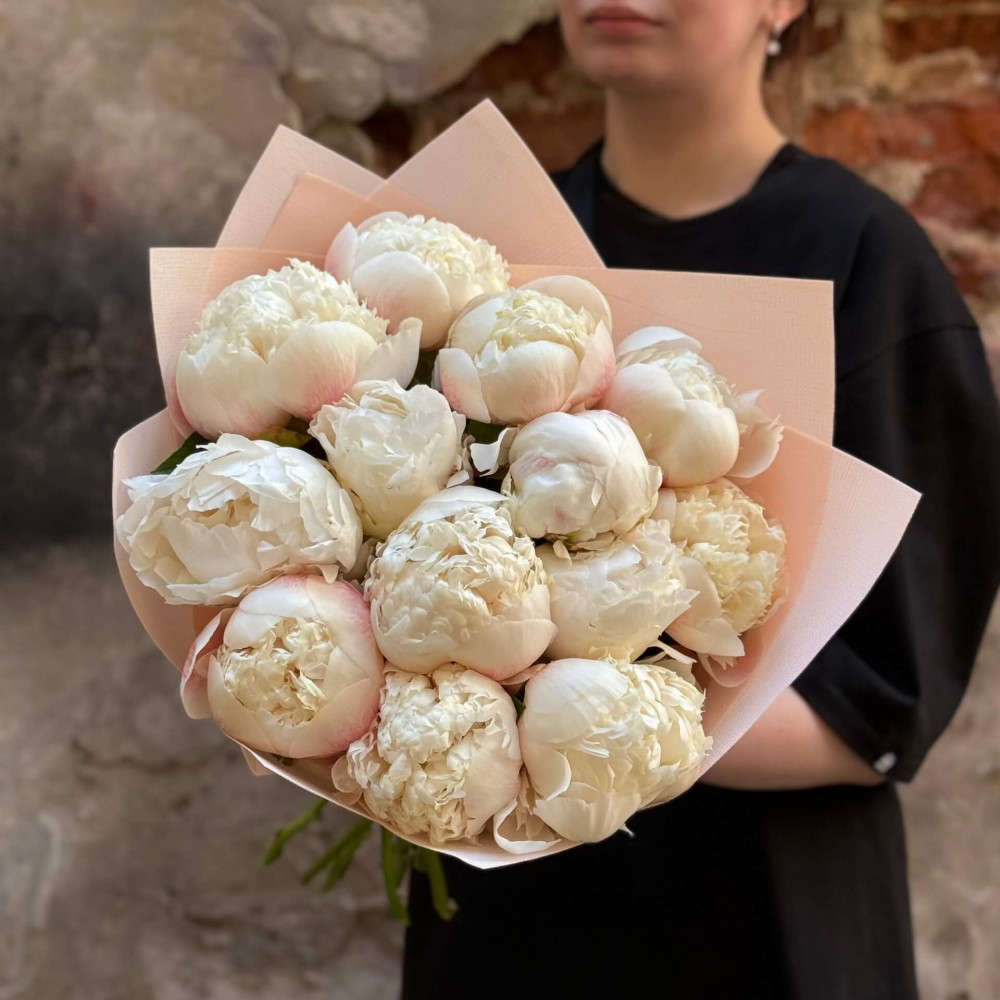 - Как заказать Румяный букет из 13 пионов «Пионовый снег»? ❯