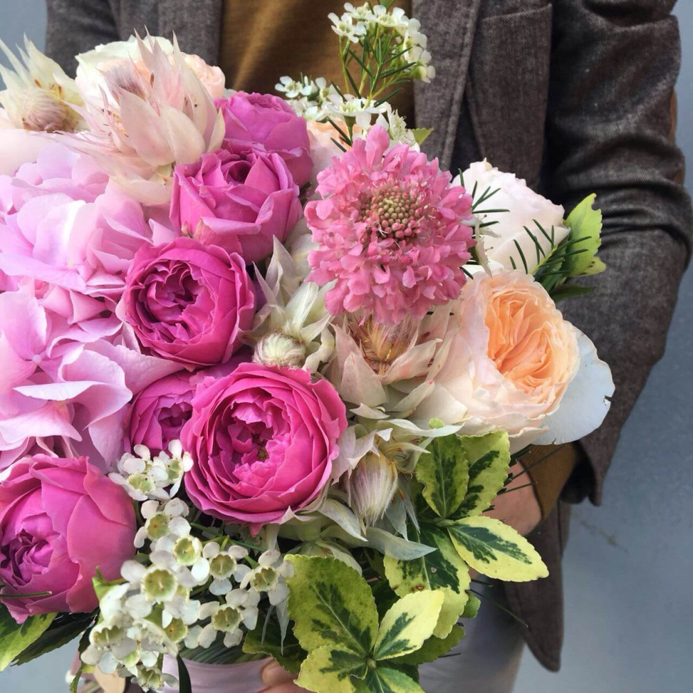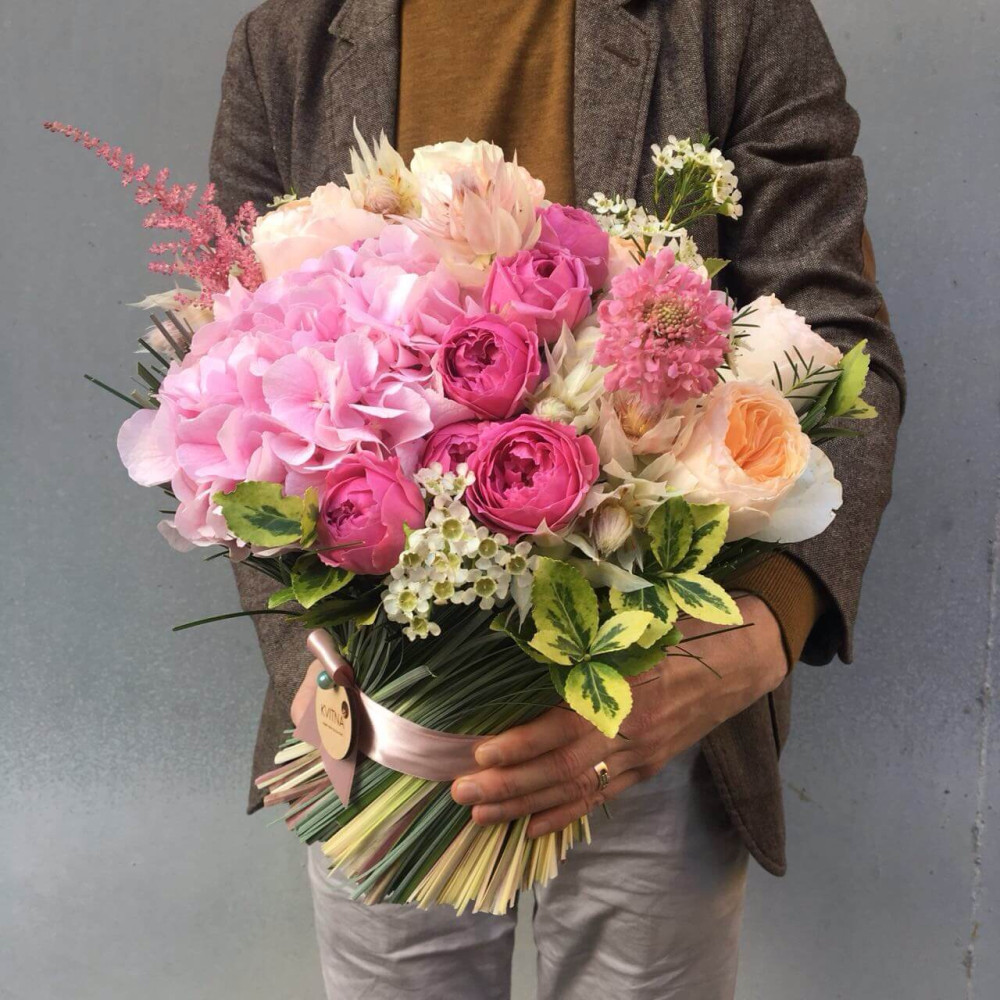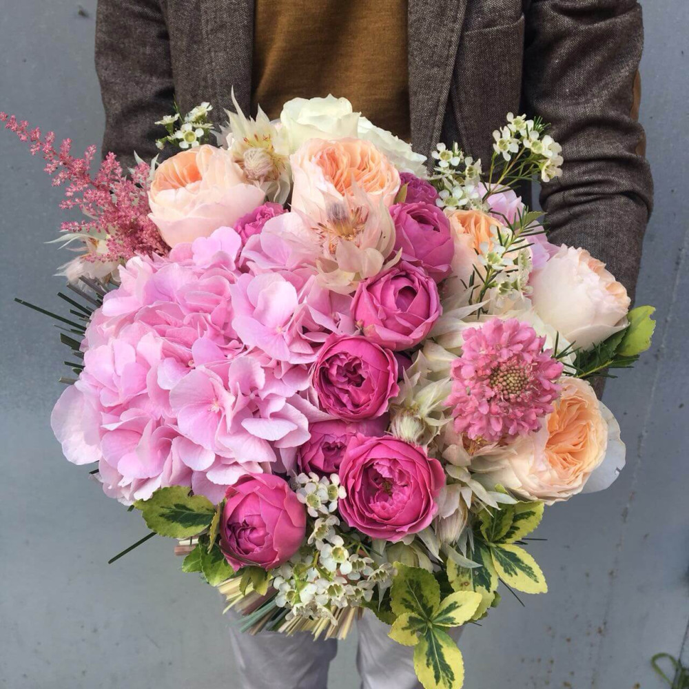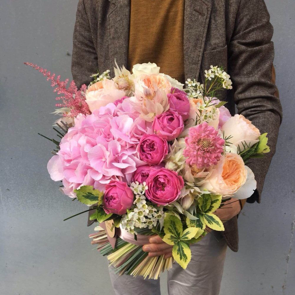 Стильное сочетание розовых оттенков садовой розы и гортанзии, оригинальный формат букета - приведет получательницу в восторг. Наши снопы содержит воду и не требует вазы.
