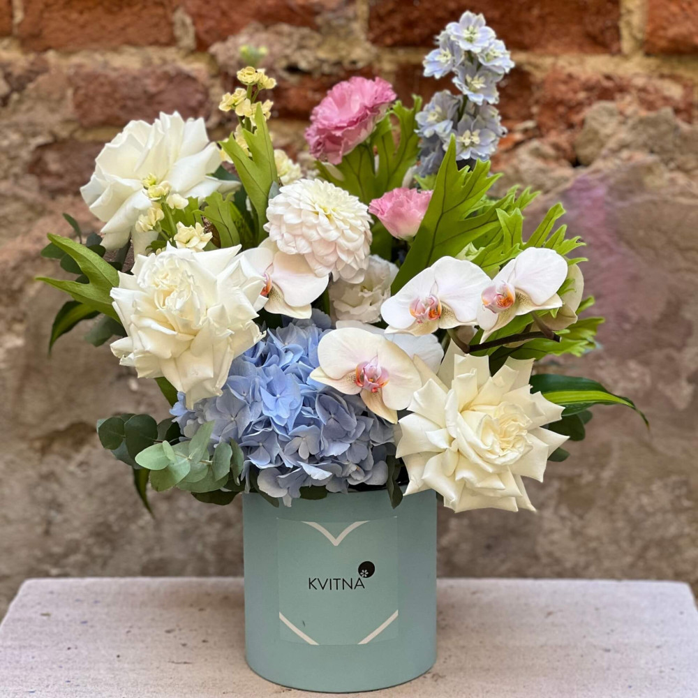 - Композиции из цветов от Kvitna (такие как коробка, корзина, сноп) собраны во флористической пене, пропитанной водой, поэтому они не нуждаются в вазе. Поскольку вода испаряется, нужно подливать в пену по стакану прохладной воды ежедневно.