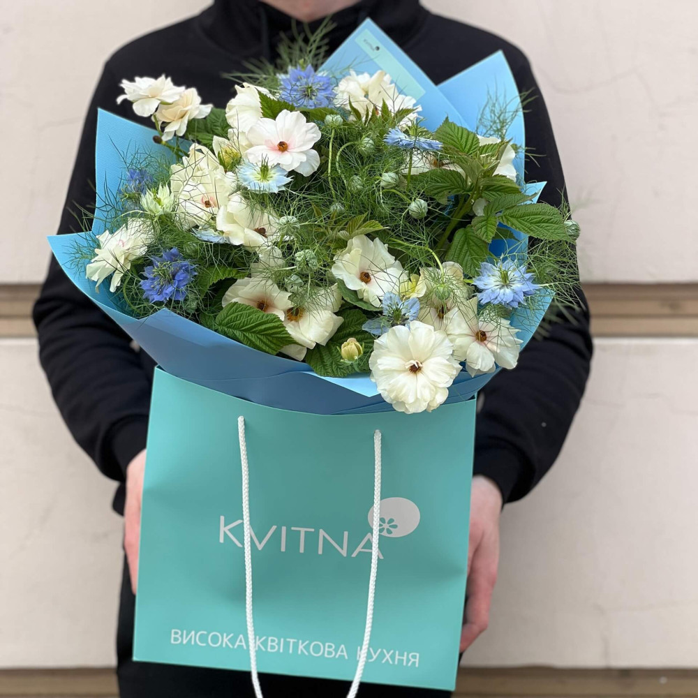 - Букеты от Kvitna доставляются в фирменной упаковке, которую нужно снять при установке цветов в вазу. Не срезайте ленту, связывающую букет, чтобы сохранить форму.