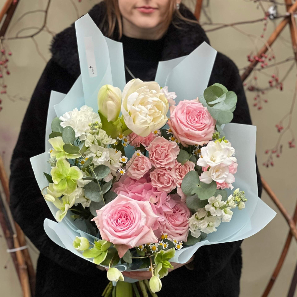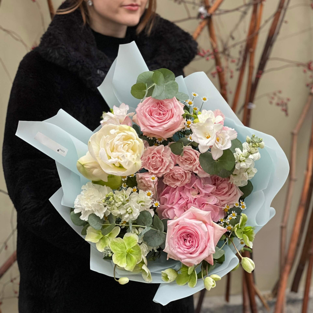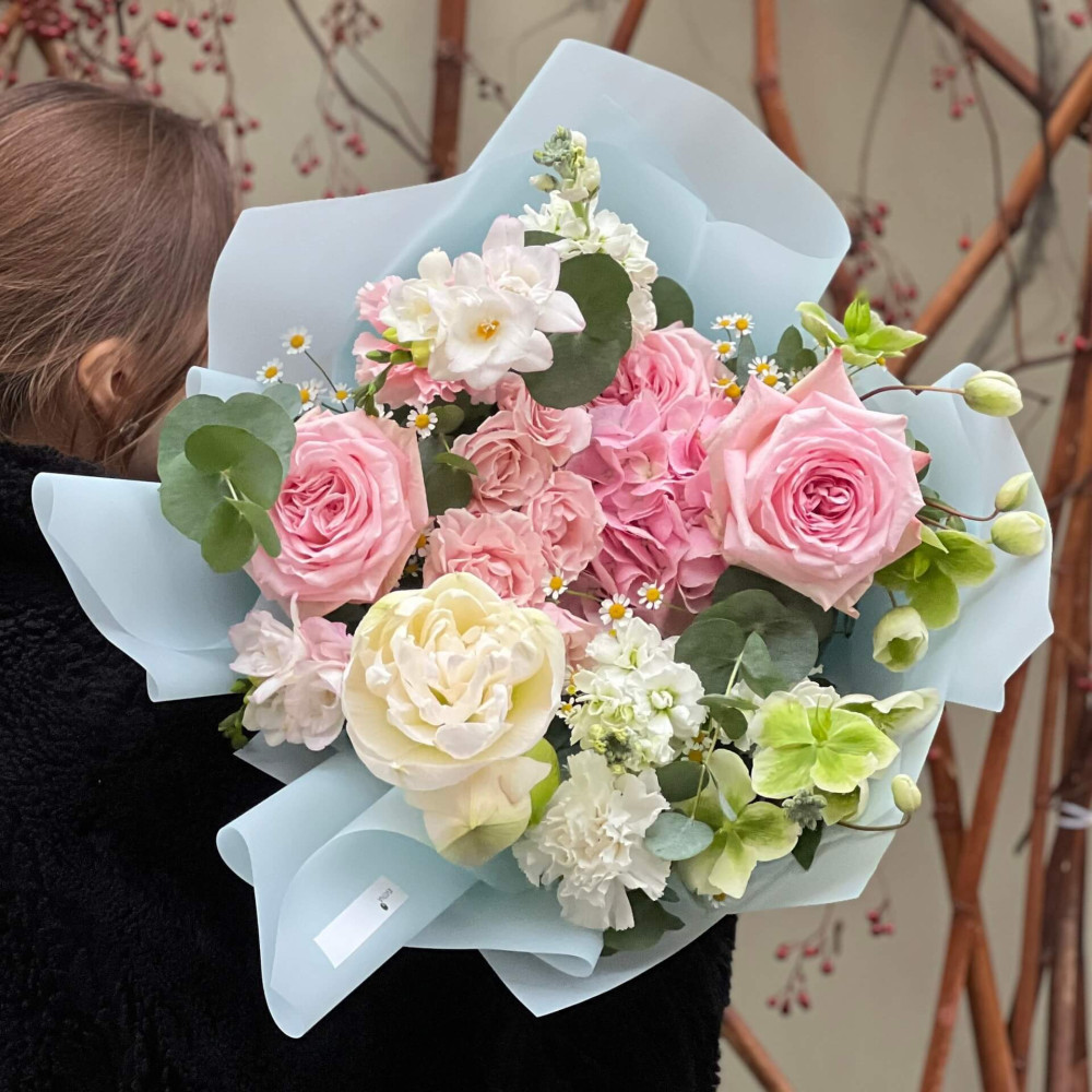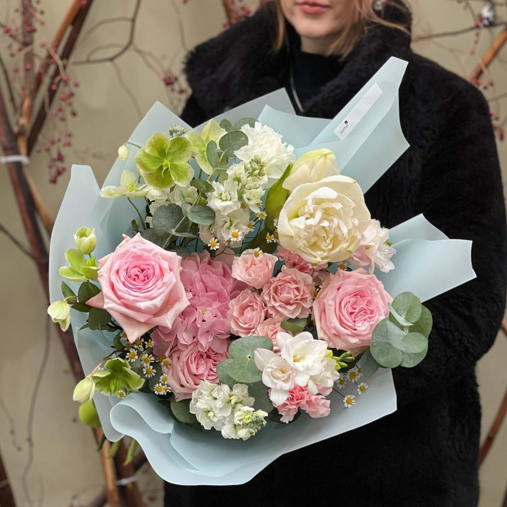 Цветы: Эвкалипт, Гортензия, Маттиола, Фрезия, Роза пионовидная, Хелеборус, Диантус (Гвоздика), Гипеаструм, Роза кустовая, Танацетум