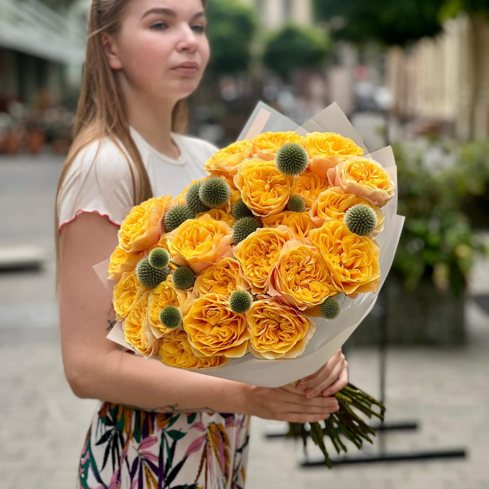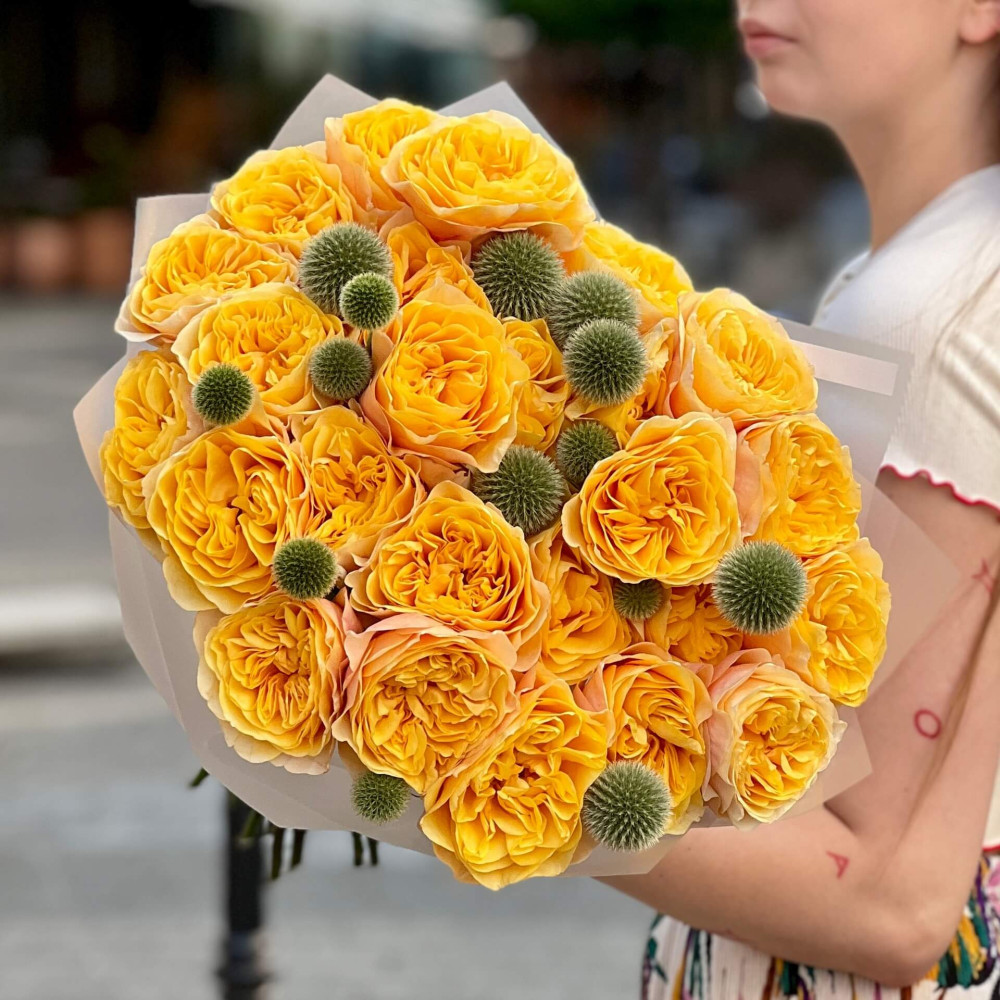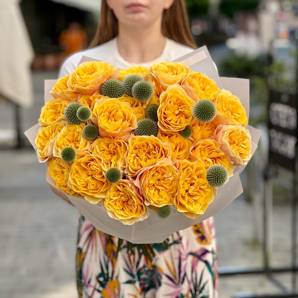 - Как заказать Тёплый букет с пионовидной розой King’s Cross и эхинопсом «Солнце Мадрида»? ❯