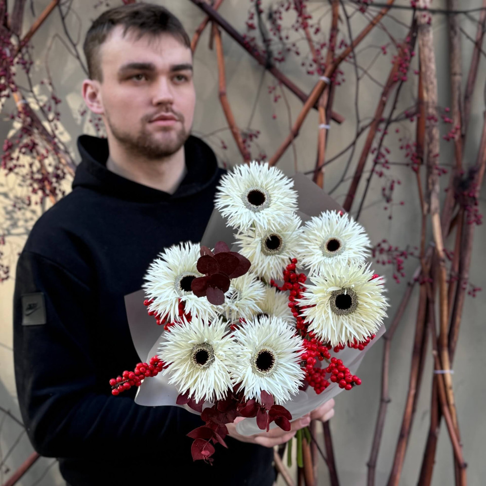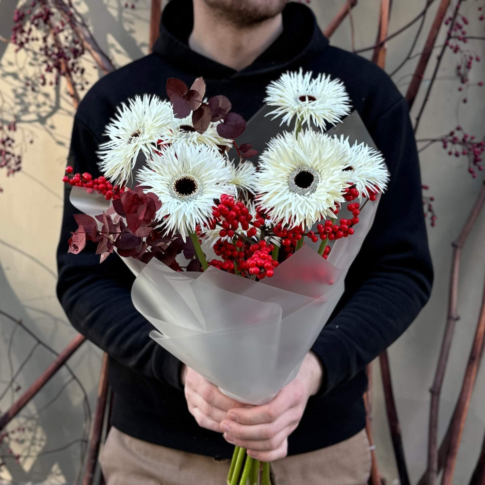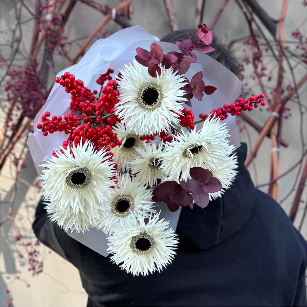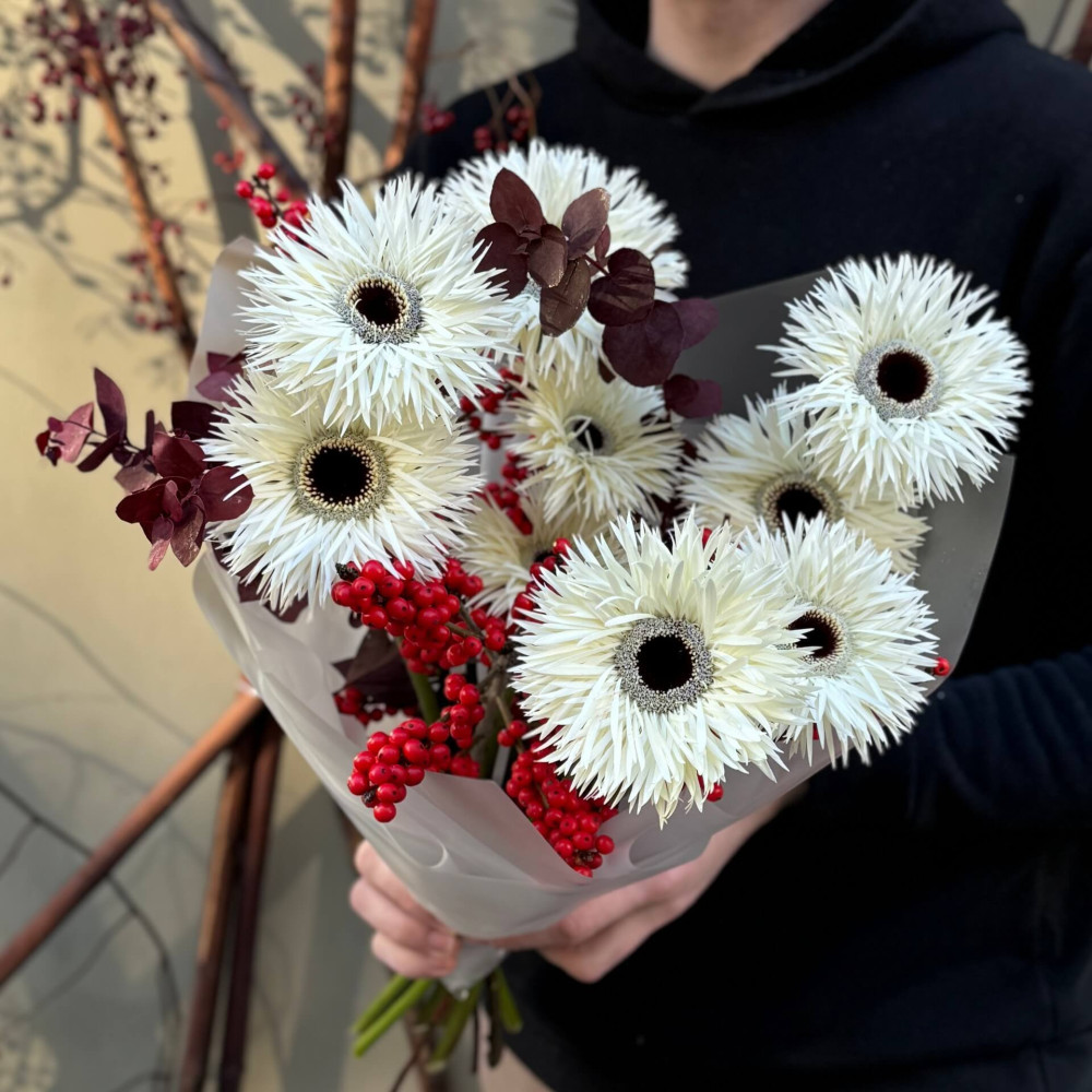 - Как заказать Интересный букет с герберами «Серебряная паутинка»? ❯