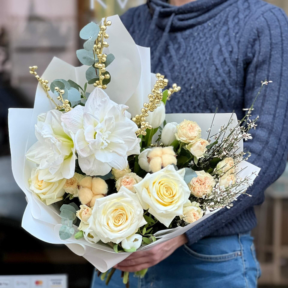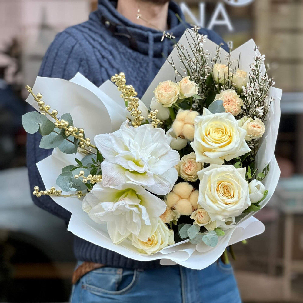 - Как заказать Изысканный букет с амариллисом и пионовидными розами «Золотое сияние»? ❯