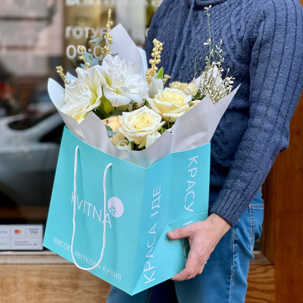 - Букеты от Kvitna доставляются в фирменной упаковке, которую нужно снять при установке цветов в вазу. Не срезайте ленту, связывающую букет, чтобы сохранить форму.