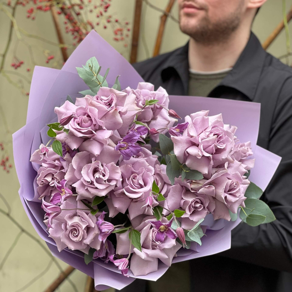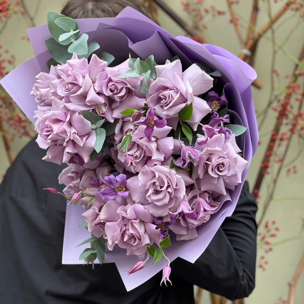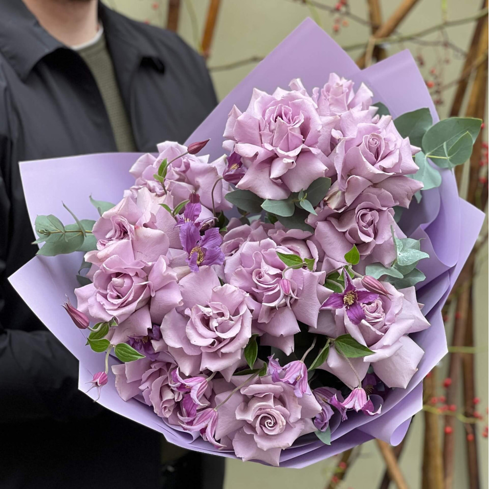 - Как заказать Вивернутые фиолетовые розы с клематисом в букете «Сиреневое облачко»? ❯