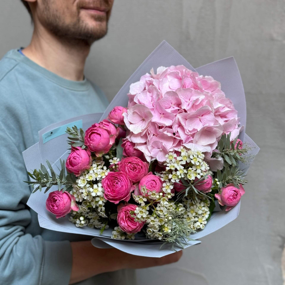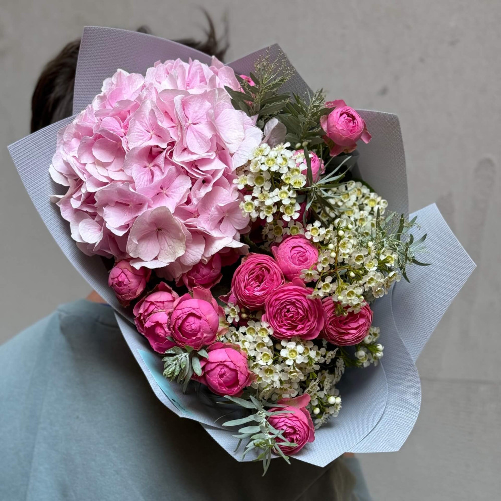 Цветы: Гортензия, Роза пионовидная кустовая, Мимоза, Хамелациум