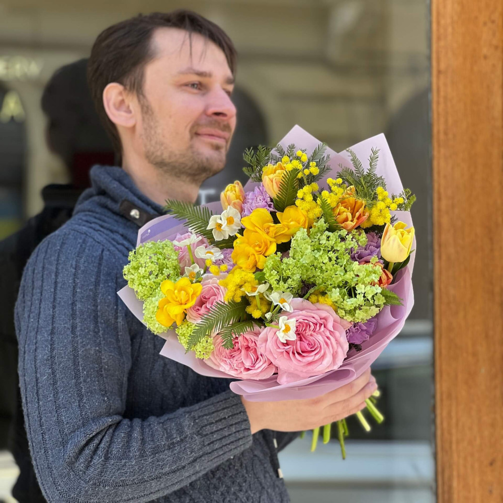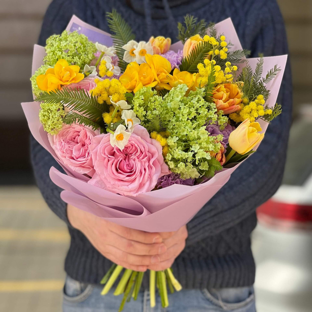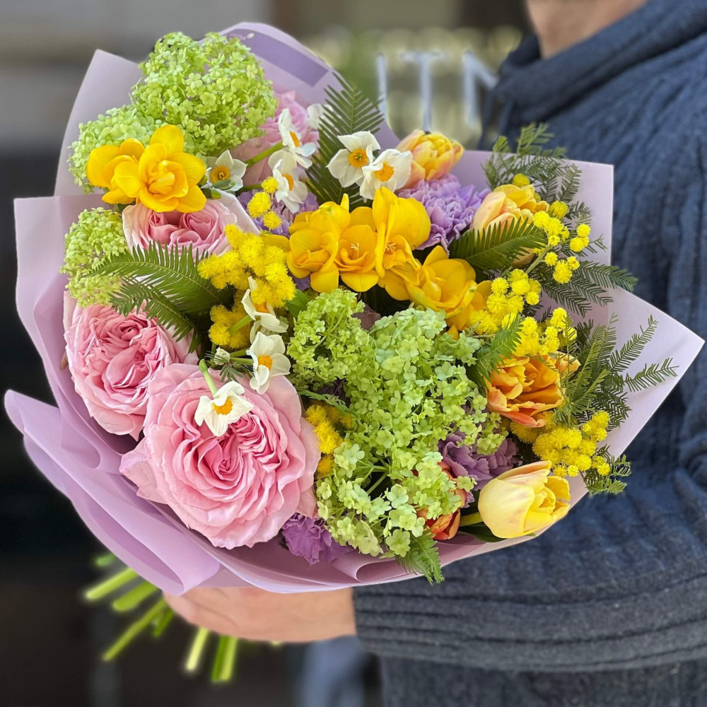 Цветы: Нарцисс, Тюльпан, Фрезия, Амбрелла, Мимоза, Роза пионовидная, Вибурнум, Диантус (Гвоздика)