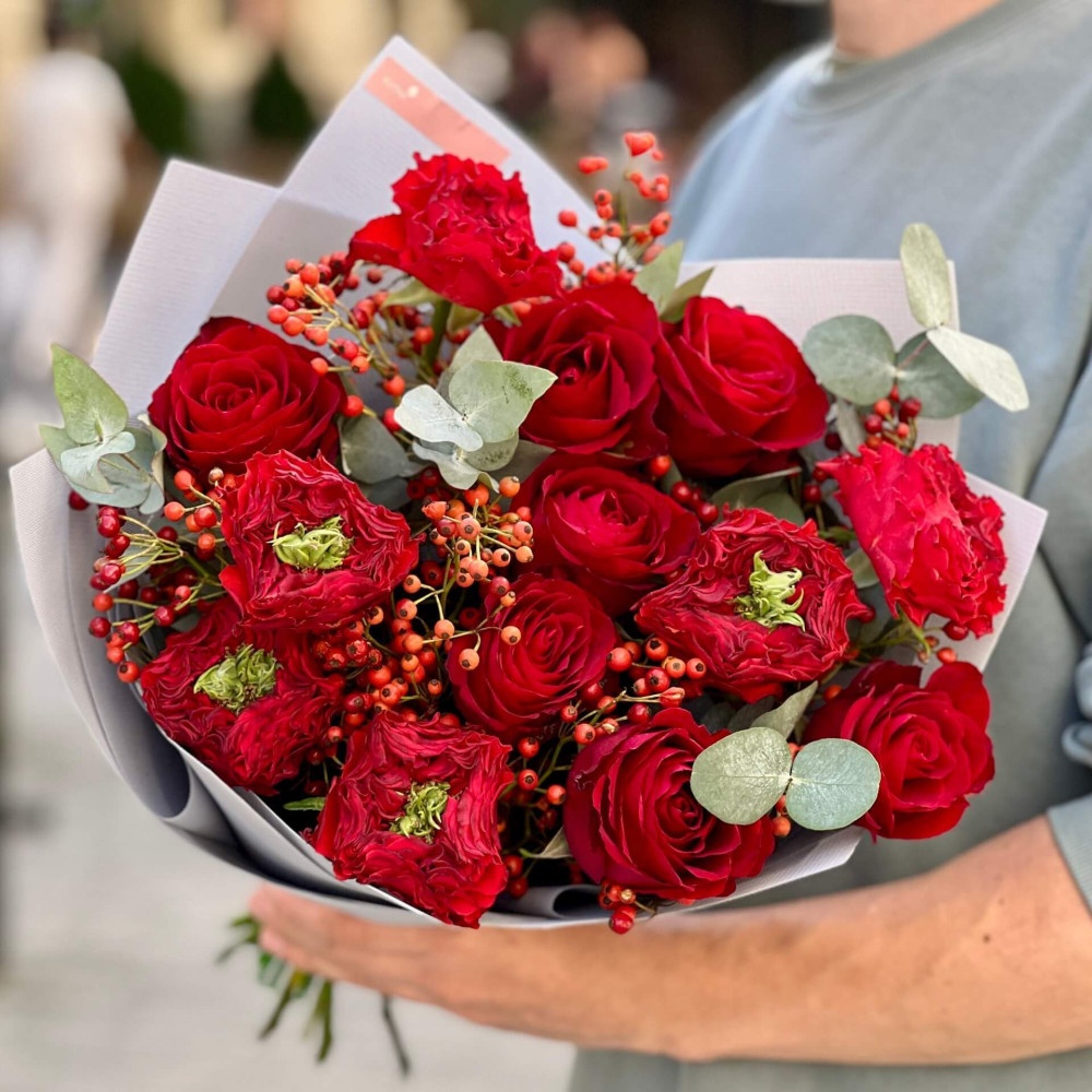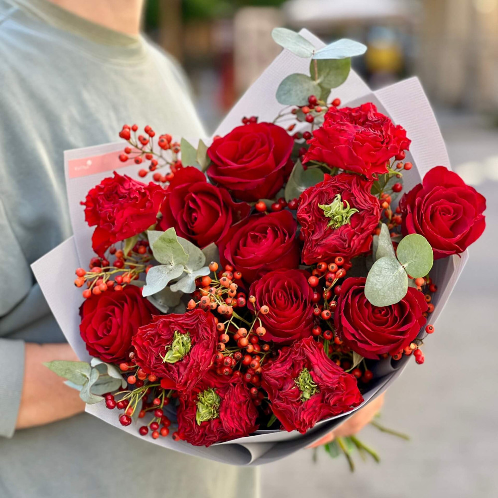 Цветы: Эвкалипт, Роза Nina, Роза пионовидная Red Eye, Шиповник