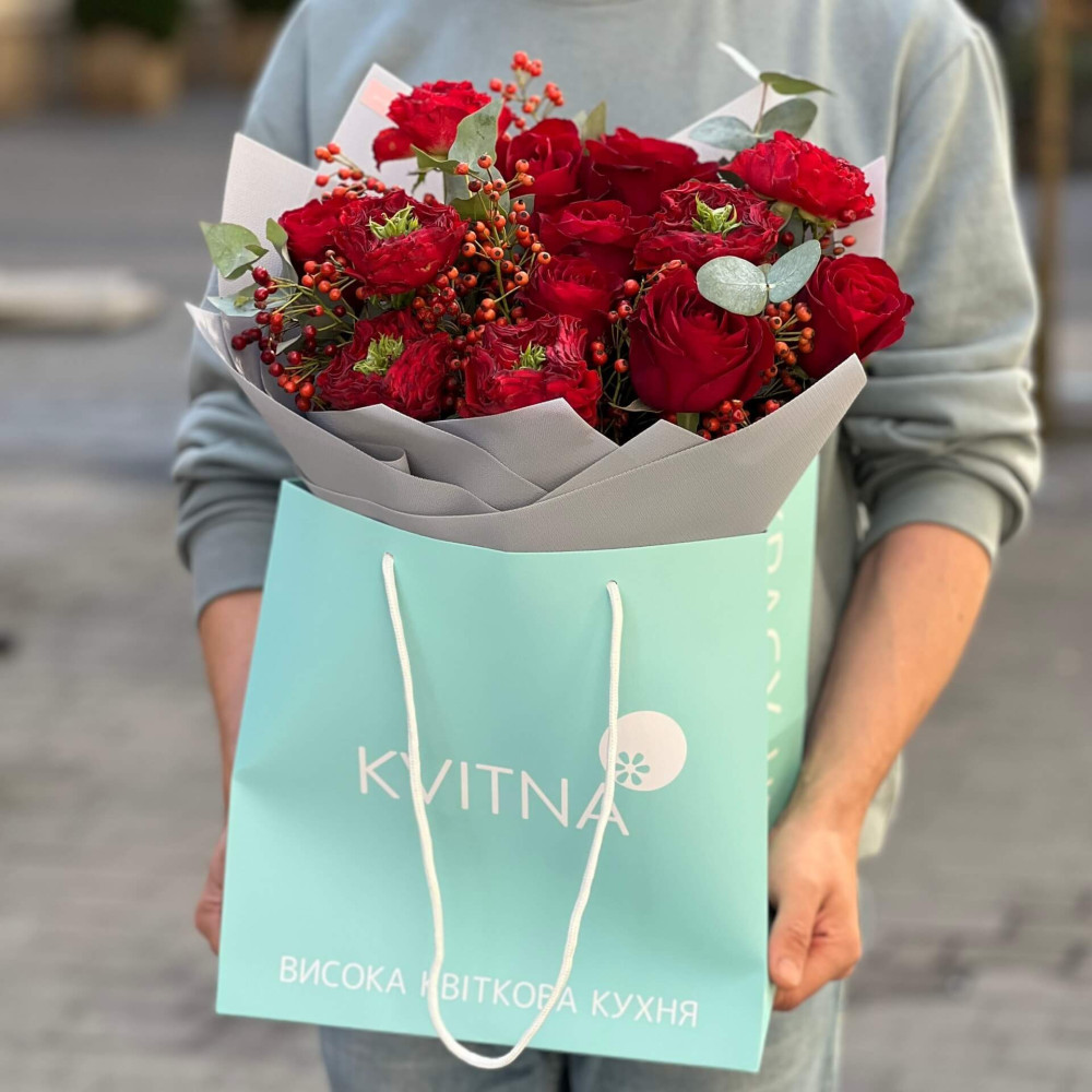 - Как заказать Яркий букет с розами «Красный шарм»? ❯