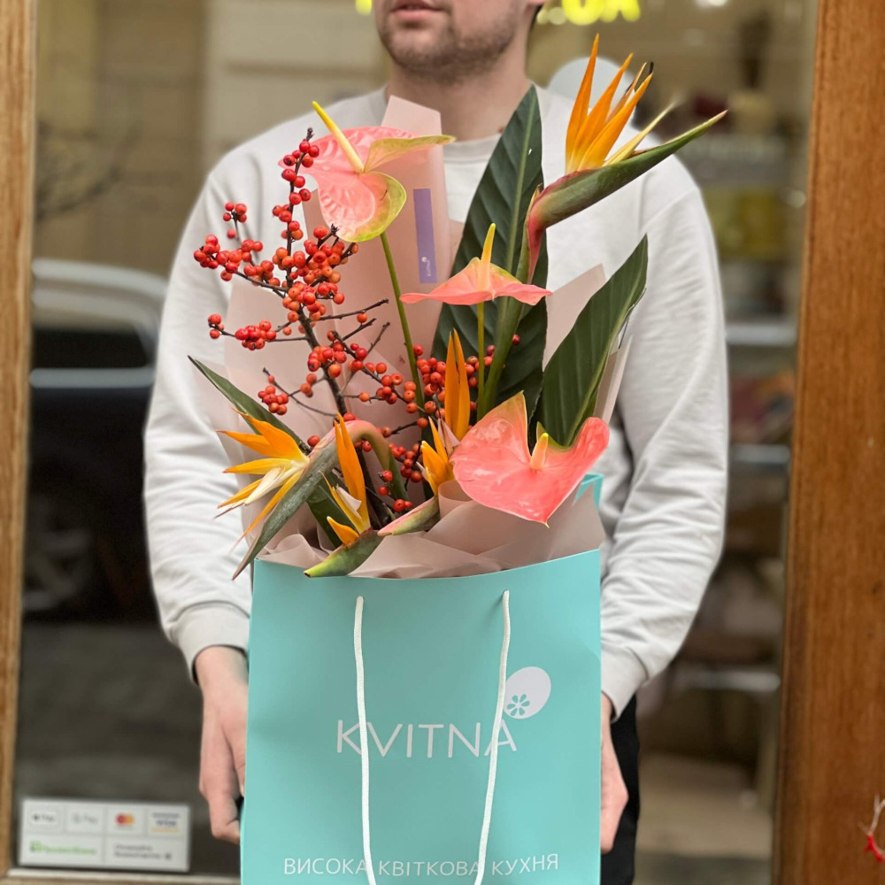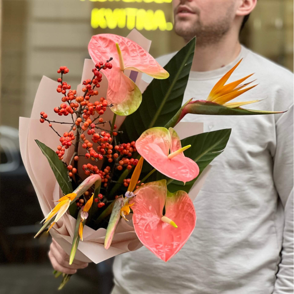 - Как заказать Яркий экзотический букет со стрелицией и антуриумом «Полёт над тропиками»? ❯