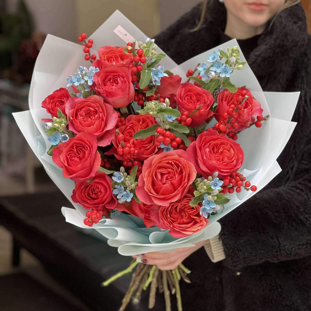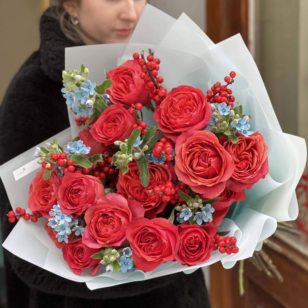 - Как заказать Яркий контрастный букет из пионовидных роз, илекса та оксипеталума «Огонь и лёд»? ❯
