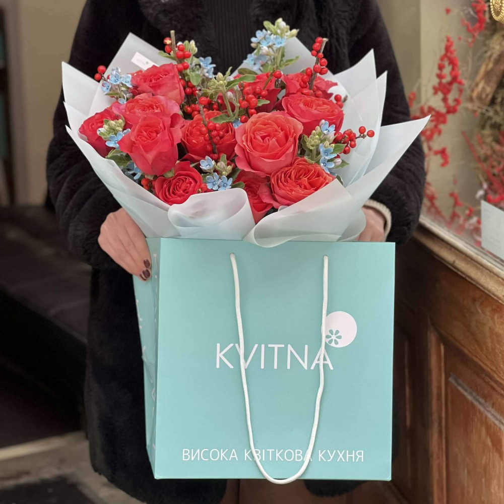 - Букеты от Kvitna доставляются в фирменной упаковке, которую нужно снять при установке цветов в вазу. Не срезайте ленту, связывающую букет, чтобы сохранить форму.