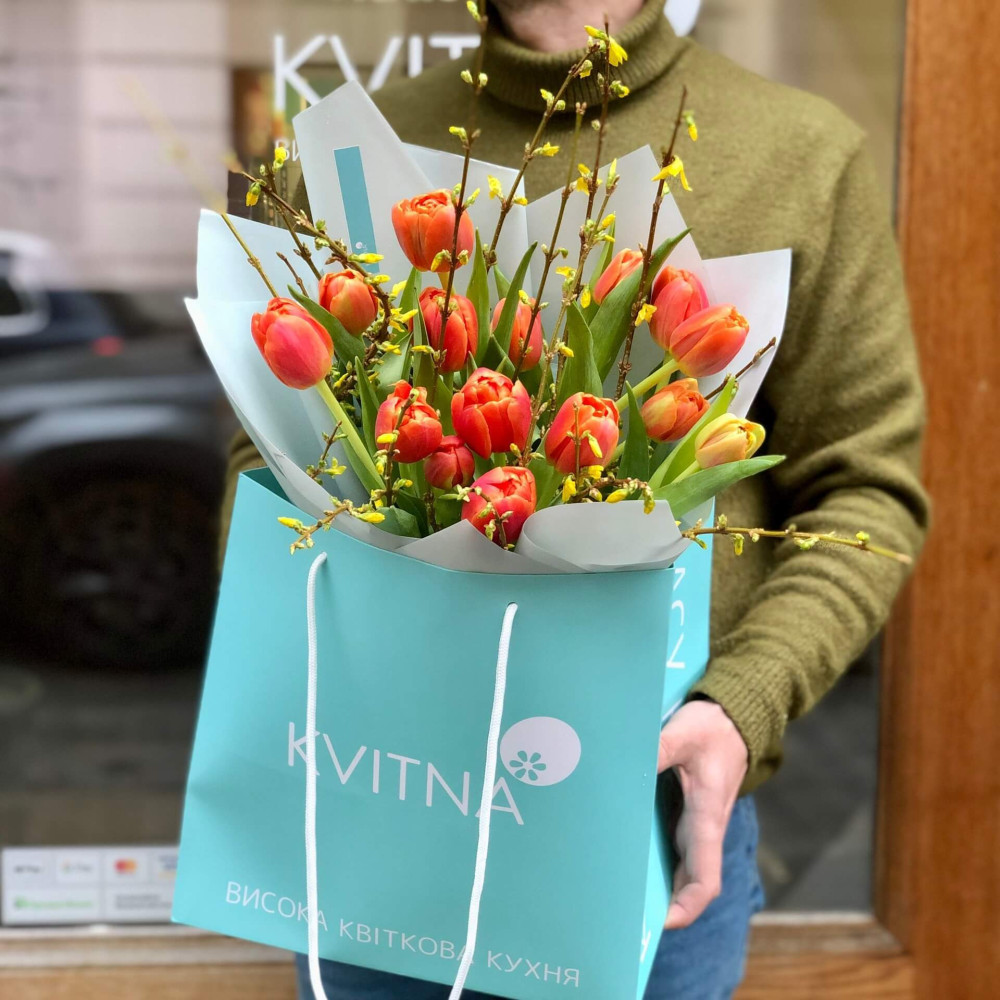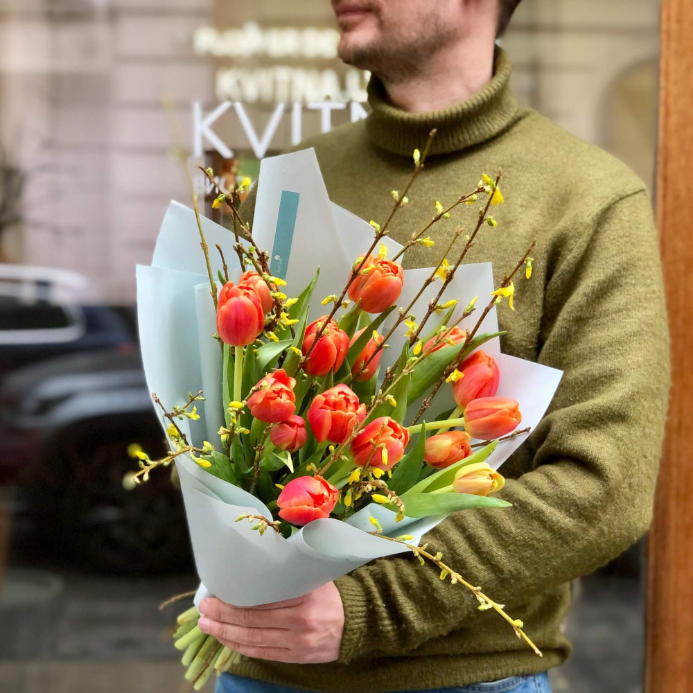 - Как заказать Яркий весенний букет из тюльпанов и форзиции «Тюльпановая самба»? ❯