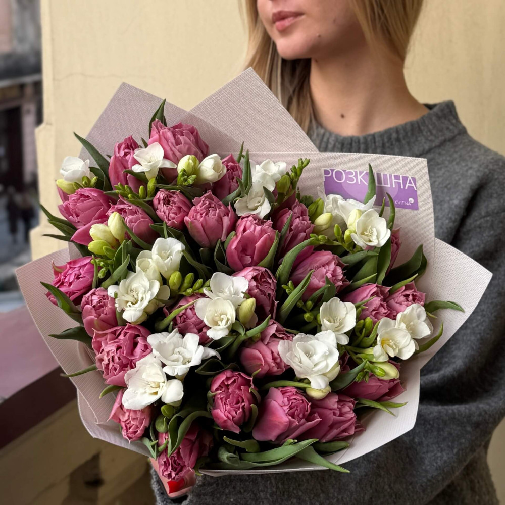 - Как заказать Уютный букет из пионовидных тюльпанов и фрезий «Штучки дрючки»? ❯