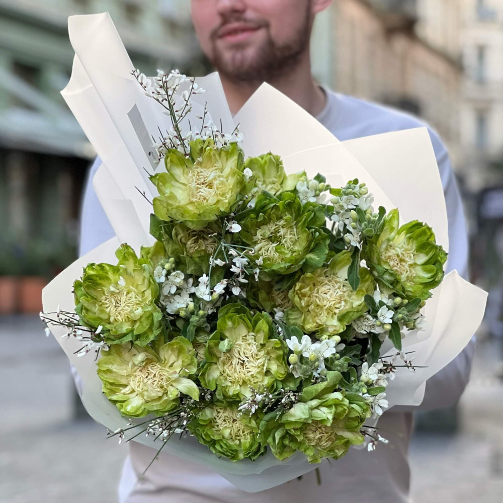 - Как заказать Зелёно-белый букет из роз и ароматной генисты и оксипеталума «Весна для Насти»? ❯