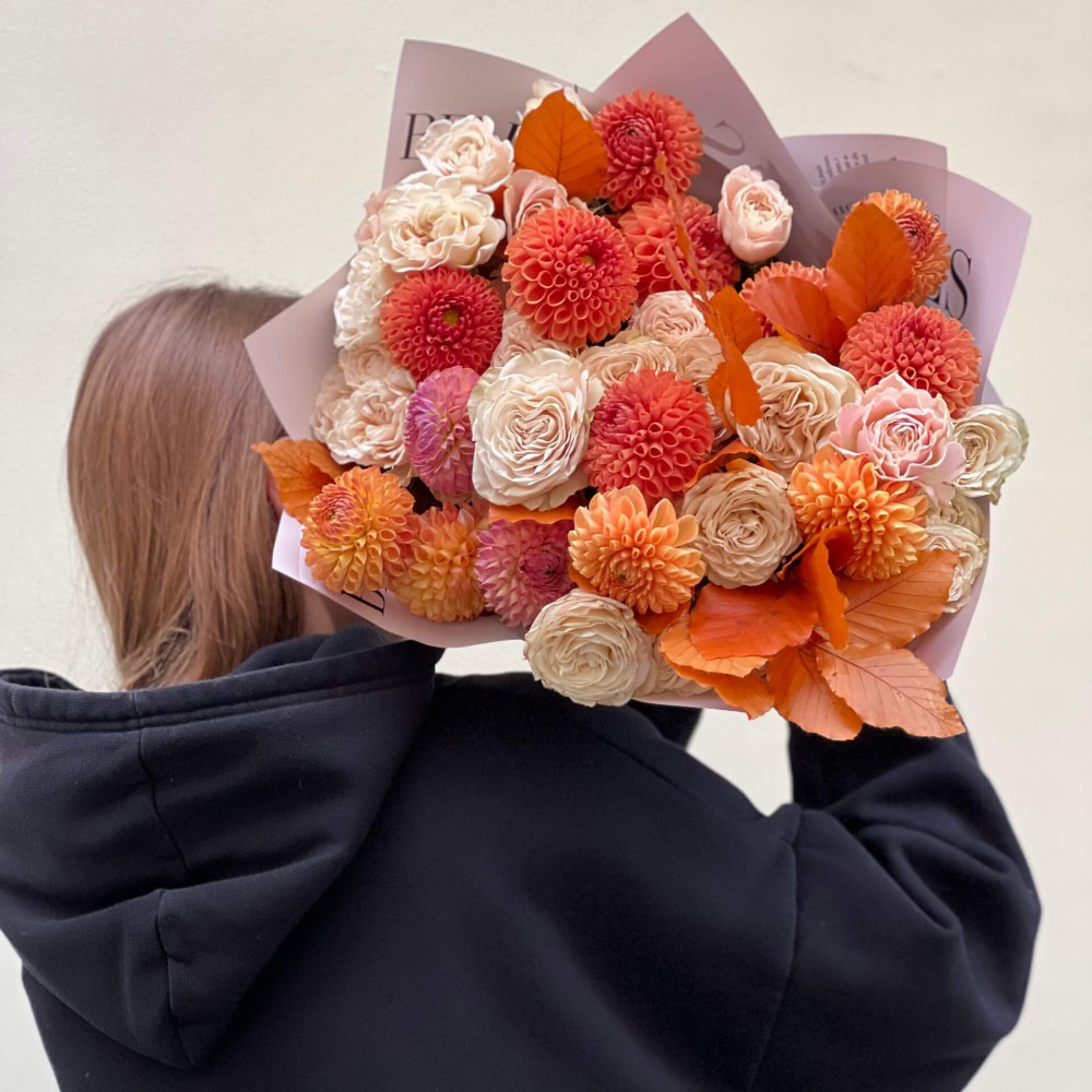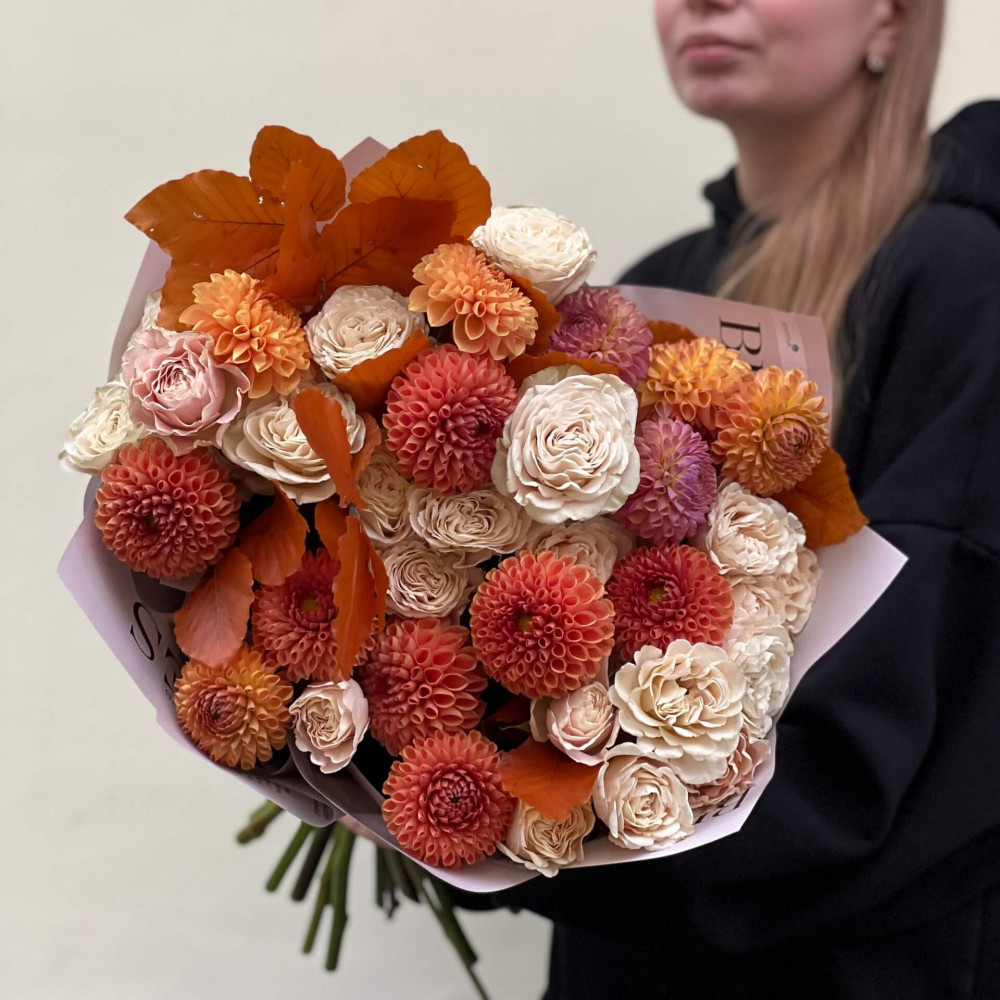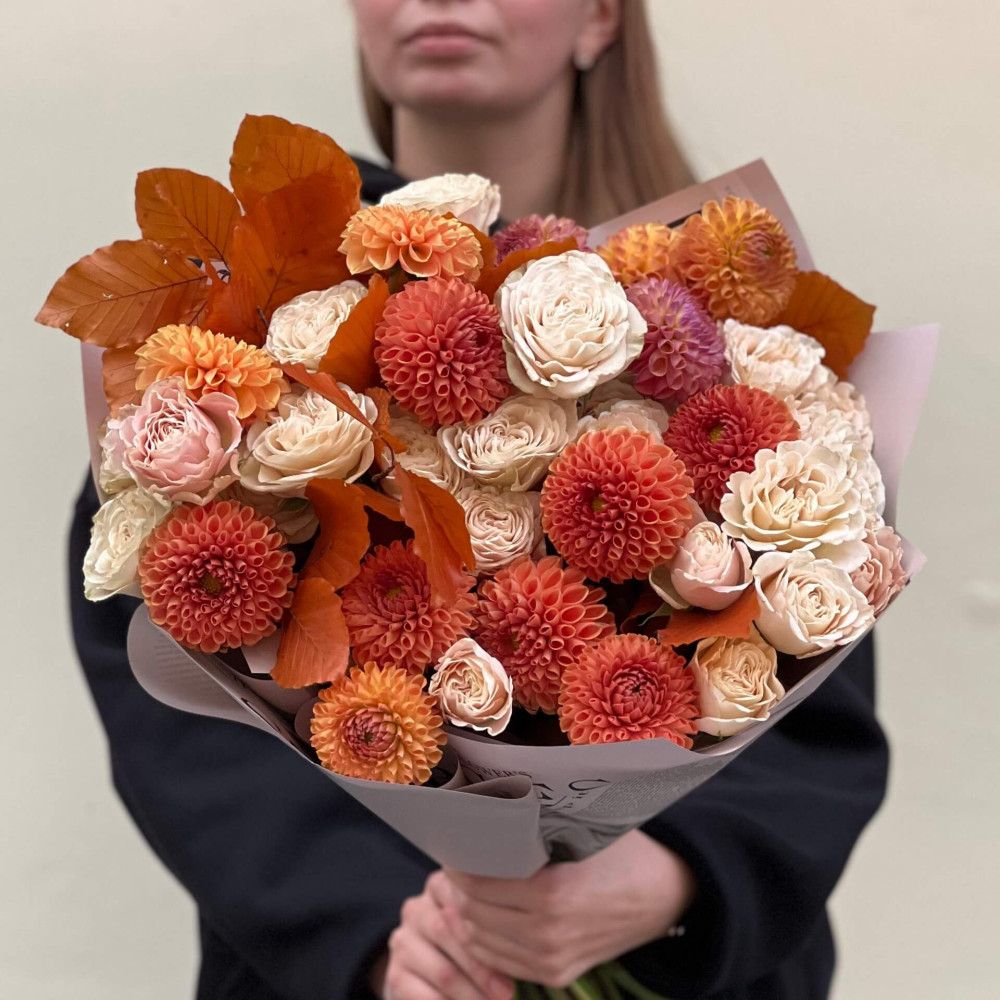 - Как заказать Согревающий осенний букет с георгинами «Кофе с молоком»? ❯